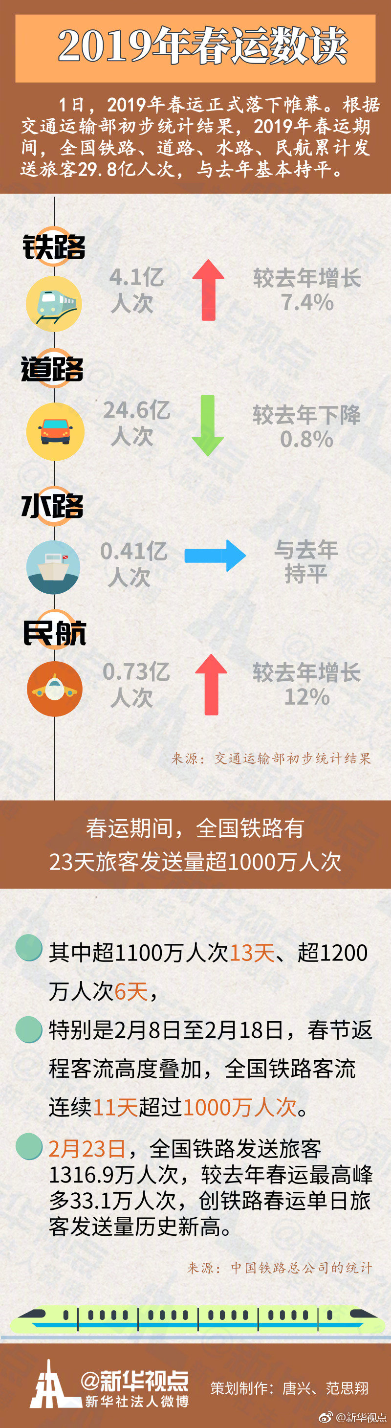 來(lái)自中國(guó)鐵路總公司的統(tǒng)計(jì)顯示,春運(yùn)期間,全國(guó)鐵路有23天旅客發(fā)送量超1000萬(wàn)人次,其中超1100萬(wàn)人次13天、超1200萬(wàn)人次6天,特別是2月8日至2月18日,春節(jié)返程客流高度疊加,全國(guó)鐵路客流連續(xù)11天超過(guò)1000萬(wàn)人次。2月23日,全國(guó)鐵路發(fā)送旅客1316.9萬(wàn)人次,較去年春運(yùn)最高峰多33.1萬(wàn)人次,創(chuàng)鐵路春運(yùn)單日旅客發(fā)送量歷史新高。