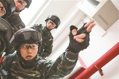 在樓房搜索應(yīng)用射擊訓(xùn)練開始前,高雄跟隊(duì)員們講解戰(zhàn)術(shù)技術(shù)要領(lǐng)。李軍 攝