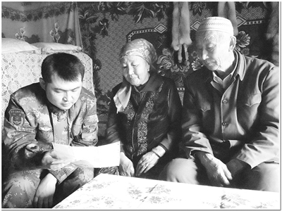 “尋親”的線(xiàn)索就這樣斷了。正當(dāng)大家一籌莫展時(shí),官兵們從另外一個(gè)村打聽(tīng)、找到了恰依肯老人的外孫,這才得知,恰依肯夫婦早在10年前就搬到了鐵熱克提鄉(xiāng)阿克哈巴南村生活。
