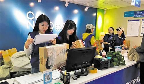 左圖 四川外國(guó)語(yǔ)大學(xué)綜合物流服務(wù)中心內(nèi),工作人員精準(zhǔn)記錄著快遞末端的流通信息。