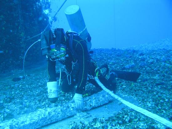 因?yàn)楣こ虧撍枰谒麻L(zhǎng)時(shí)間作業(yè),打撈局的潛水員們不能像人們常見的潛水員那樣,利用背后的氣瓶供氣。他們靠一根甘蔗粗細(xì)的長(zhǎng)管來(lái)維持水下的呼吸,在工程潛水領(lǐng)域,這根管子被稱作“臍帶”。