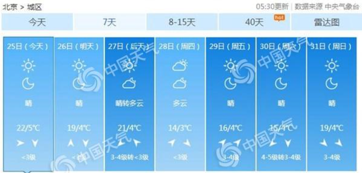 預(yù)計,本周(25-31日)北京天氣以晴為主,氣溫多起伏,其中今天最高氣溫22℃,周四將降至14℃,乍暖還寒,公眾還需關(guān)注臨近預(yù)報,根據(jù)天氣適當(dāng)增減衣物。