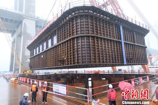 圖為福廈高鐵泉州灣跨海大橋77號主墩鋼吊箱吊裝?!±顦s鑫 攝