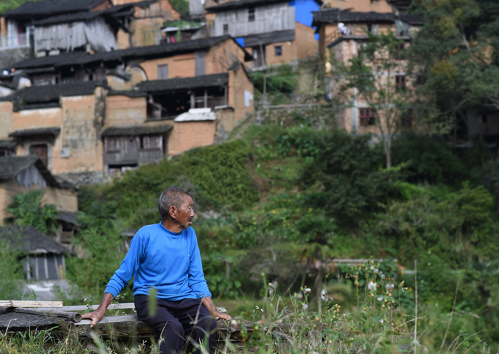 “空心村”內(nèi),一位老人坐在柵欄上 宋為偉 攝