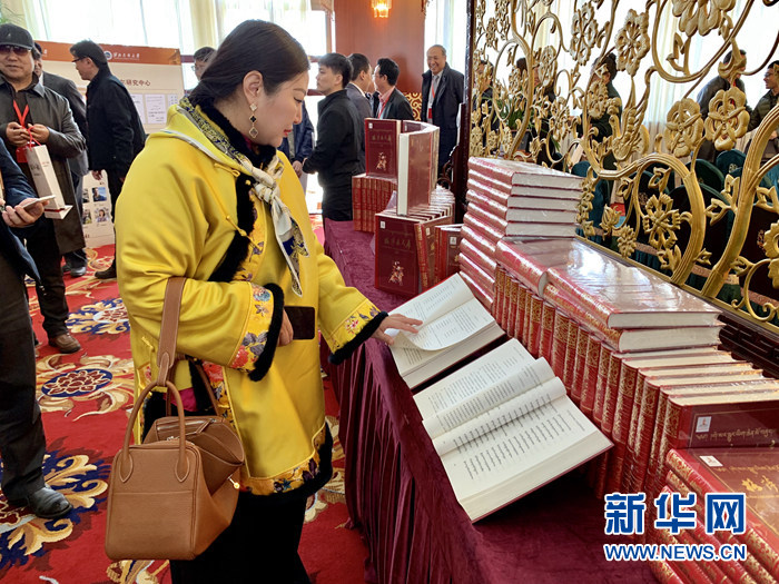 與會(huì)嘉賓在發(fā)布儀式現(xiàn)場(chǎng)翻閱《格薩爾文庫(kù)》。新華網(wǎng) 王頔 攝