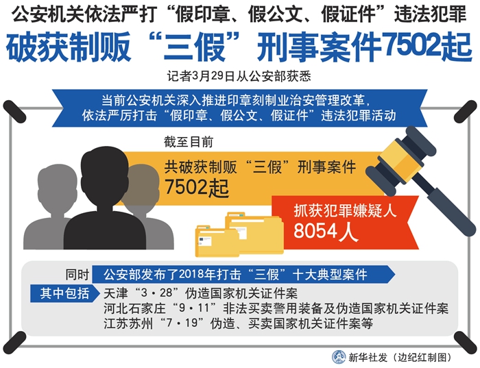 新華社北京3月29日電(記者丁小溪)記者29日從公安部獲悉,當(dāng)前公安機關(guān)深入推進印章刻制業(yè)治安管理改革,依法嚴(yán)厲打擊“假印章、假公文、假證件”違法犯罪活動,截至目前,共破獲制販“三假”刑事案件7502起,抓獲犯罪嫌疑人8054人。