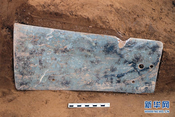 這是陜西延安蘆山峁新石器時代遺址營盤梁院落北門外祭祀坑出土大玉刀(資料照片)。新華社發(fā)