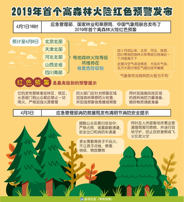“此次紅色預(yù)警是三部門(mén)綜合考慮氣象條件、林區(qū)物候及衛(wèi)星林火監(jiān)測(cè)、清明節(jié)期間祭掃影響等情況,經(jīng)過(guò)會(huì)商研判共同發(fā)布的。”中國(guó)氣象局公共氣象服務(wù)中心副首席楊曉丹說(shuō),自3月初以來(lái),北京、河北、陜西、四川等地的森林火險(xiǎn)等級(jí)一直居高不下,已持續(xù)近一個(gè)月;近期冷空氣活動(dòng)頻發(fā)、大風(fēng)天氣多,北方大部分地區(qū)氣溫比往年偏高,氣象條件對(duì)森林防火極為不利。