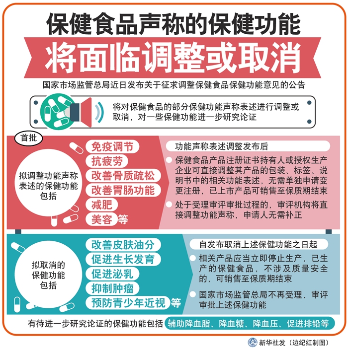 國家市場監(jiān)管總局在對不同歷史時期批準(zhǔn)的保健功能進行梳理匯總的基礎(chǔ)上,組織醫(yī)學(xué)、藥學(xué)、食品、營養(yǎng)等領(lǐng)域?qū)<疫M行多次論證,研究提出了調(diào)整保健功能的意見。堵塞保健食品功能聲稱被虛假宣傳的漏洞,提升消費者對保健食品功能聲稱的科學(xué)認知和準(zhǔn)確判定,避免與藥品疾病預(yù)防和治療作用混淆。