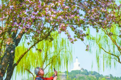 近日,北海公園西岸三十多年樹齡的西府海棠花開正盛,綠肥紅瘦吸引市民前來觀賞。本報記者 鄧偉攝