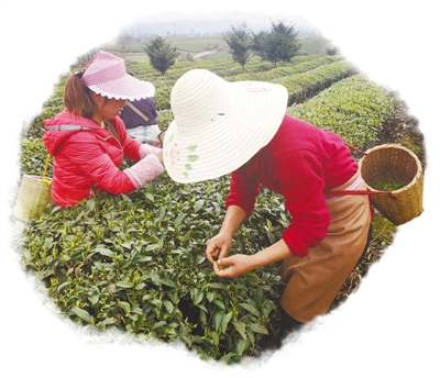 正值初春,茶海一股股綠色波浪間,采摘明前茶的身影漸漸多起來(lái)。走近些,只見(jiàn)茶農(nóng)兩手并用,上下翻騰,大拇指和食指準(zhǔn)確地將茶青捏住,用力一提,手腕一甩,鮮嫩的芽便收入了斜挎背的竹簍里。切不可用指甲掐,否則破壞了細(xì)胞結(jié)構(gòu),茶青是要變黑的。