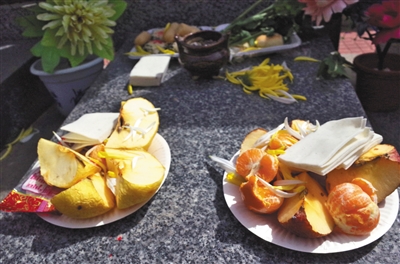 據(jù)其介紹,園方不會(huì)拿走祭品,但鮮花、水果等會(huì)腐爛,墓園的工作人員兩三天會(huì)清理一次。
