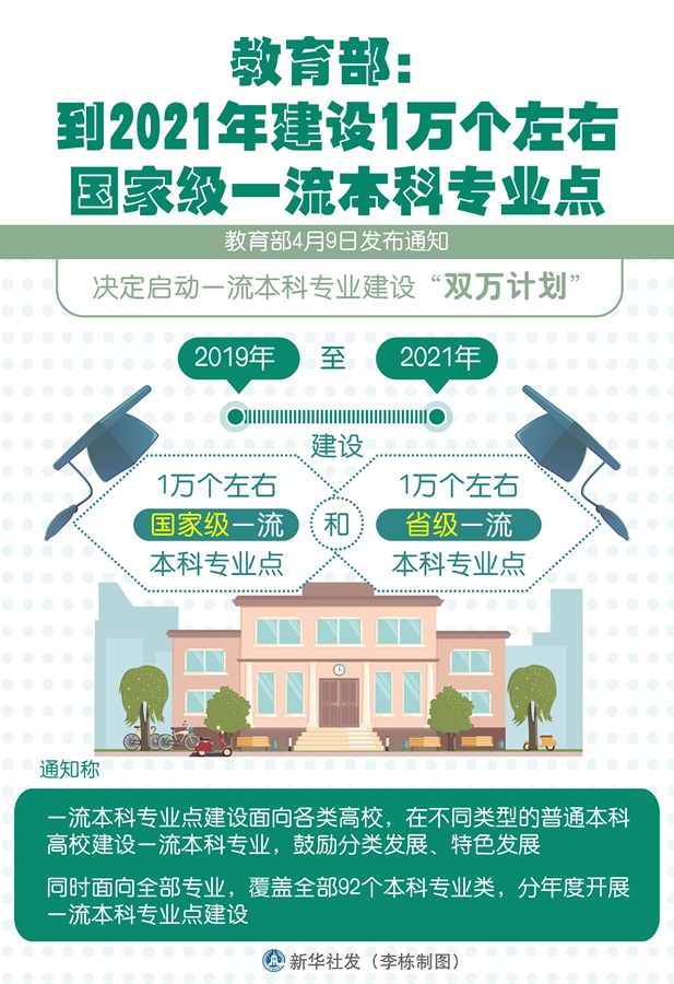新華社北京4月9日電(記者施雨岑)教育部9日發(fā)布通知,決定啟動一流本科專業(yè)建設(shè)“雙萬計(jì)劃”,2019年至2021年建設(shè)1萬個(gè)左右國家級一流本科專業(yè)點(diǎn)和1萬個(gè)左右省級一流本科專業(yè)點(diǎn)。