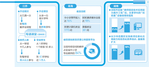 然而,要充分發(fā)揮教育信息化的優(yōu)勢,還需實(shí)現(xiàn)信息化手段從“用起來”到“用得好”轉(zhuǎn)變。這就需要依靠培訓(xùn),使教育管理部門和一線師生的信息化素養(yǎng)同步提升。 湖南多地實(shí)行四級(jí)培訓(xùn)制度:通過“國培計(jì)劃”等,培訓(xùn)中小學(xué)校長及教育主管部門人員;通過湖南省中小學(xué)教師信息技術(shù)應(yīng)用能力提升工程,培訓(xùn)信息技術(shù)骨干教師和專任骨干教師;通過組織電化教育館及高校等單位的專家學(xué)者赴基層,培訓(xùn)教育信息化基礎(chǔ)教師;培育出來的“種子教師”,為所在學(xué)校的科任教師普及教育信息化知識(shí)。