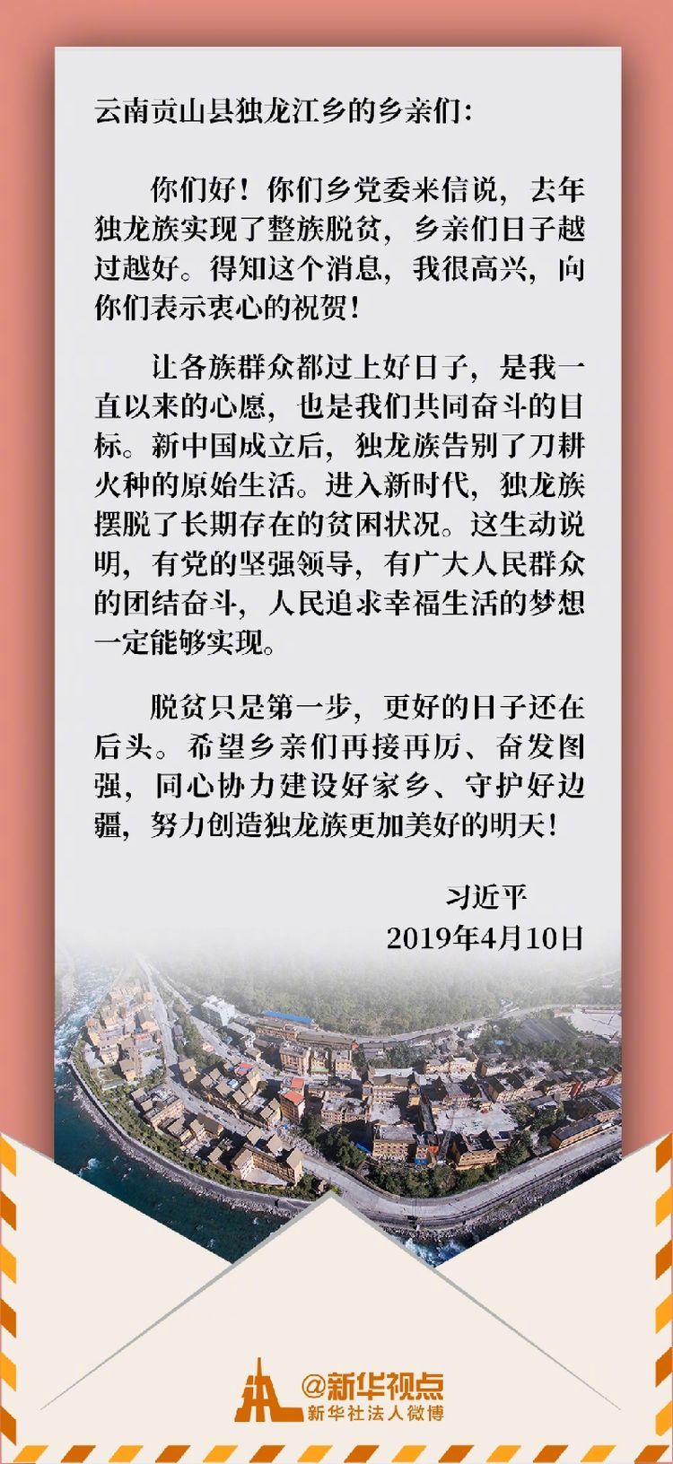 這一天,習(xí)近平總書(shū)記給他們回信。總書(shū)記在信中祝賀獨(dú)龍族實(shí)現(xiàn)整族脫貧,勉勵(lì)鄉(xiāng)親們?yōu)檫^(guò)上更加幸福美好的生活繼續(xù)團(tuán)結(jié)奮斗。