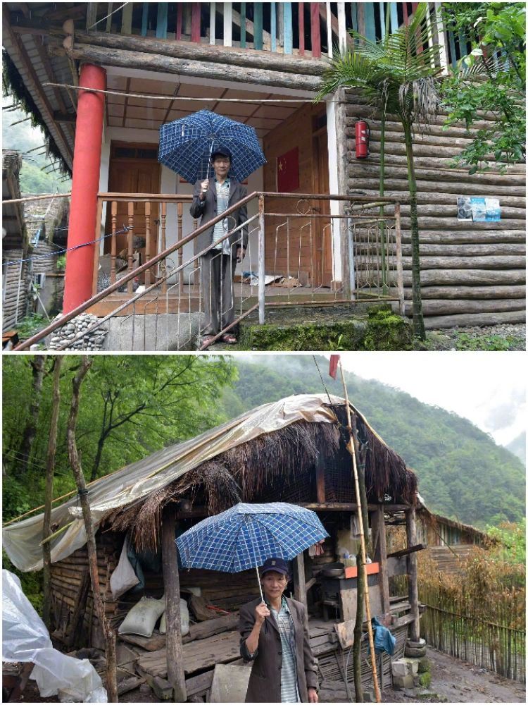 拼版照片:上圖為獨(dú)龍江鄉(xiāng)巴坡村的普學(xué)清站在新建的安居房臺(tái)階上;下圖為普學(xué)清站在以前居住的茅草屋前(2017年5月25日攝)