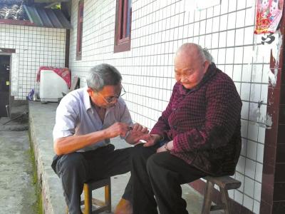 4月11日上午,在內(nèi)江市東興區(qū)高梁鎮(zhèn)楊嶺村一戶農(nóng)房里,73歲的村民陳應(yīng)全正拿著梳子?jì)故斓貫?6歲的母親梳頭。梳完頭,陳應(yīng)全又拿出蘋果,削皮后分成小塊喂給母親吃。