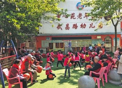 這是一場老幼同樂活動,孩子和老人來自武漢市的老幼同養(yǎng)機構(gòu)——童心苑。童心苑實際是個代稱,由武昌路幼兒園和武昌區(qū)復興路社區(qū)的童心苑老年公寓(下稱“老年公寓”)共同組成。在這里,養(yǎng)老院和幼兒園開在一起,老人和幼兒結(jié)合供養(yǎng)。