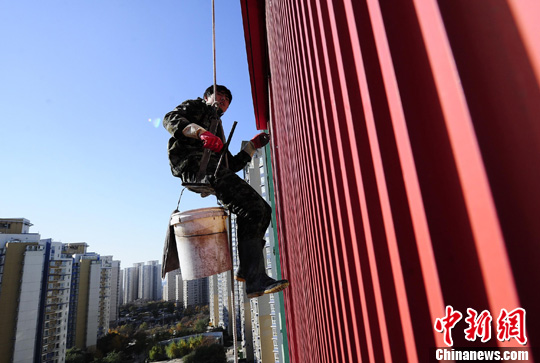 資料圖:一名外墻清洗工人在北京某住宅小區(qū)高空作業(yè)。中新社發(fā) 侯宇 攝