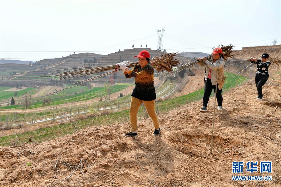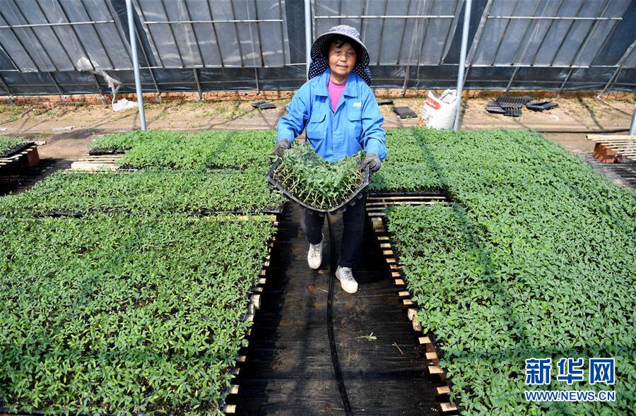 村民在扶貧大棚內搬運培育的西紅柿幼苗