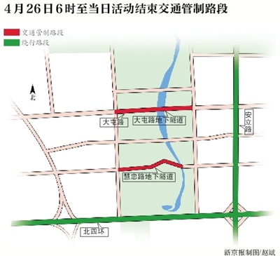 4月26日6時至當(dāng)日活動結(jié)束,大屯路地下隧道、慧忠路地下隧道,除持有“高峰論壇”專用證件的車輛外,禁止其他車輛通行。