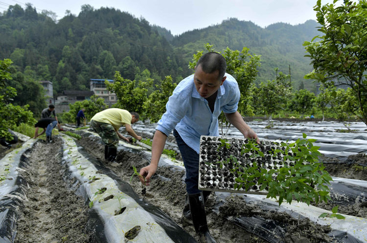 湖北宣恩縣直機關(guān)干部與村民一起移栽辣椒苗