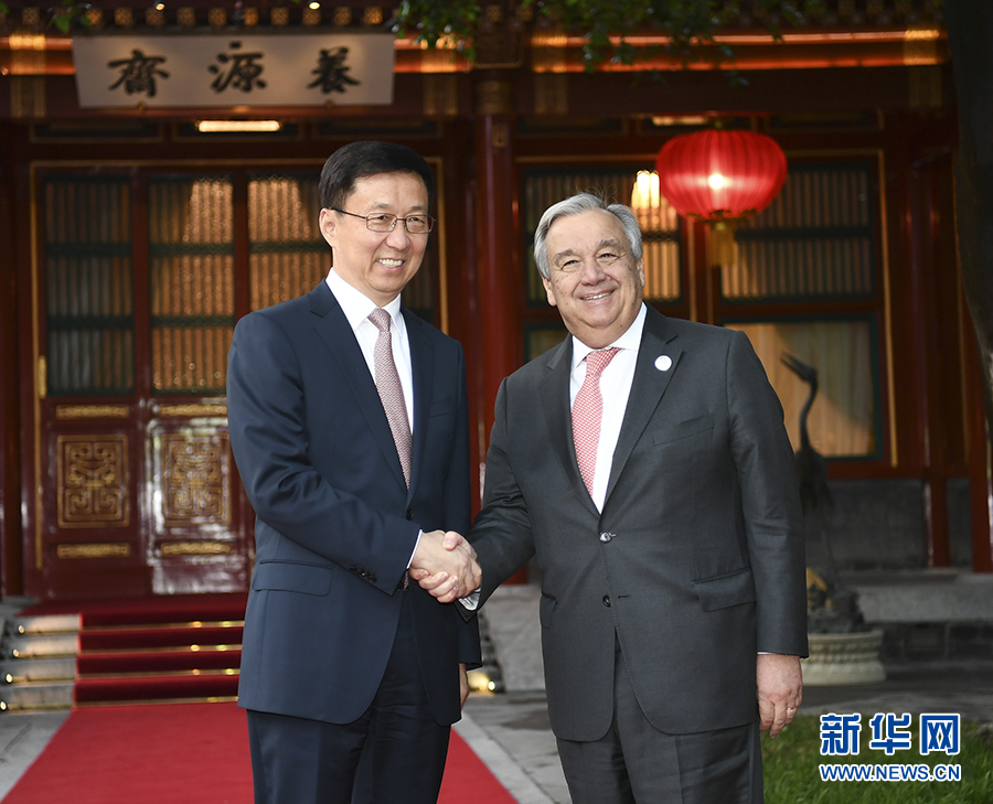 4月27日,中共中央政治局常委、國務(wù)院副總理韓正在北京釣魚臺國賓館會見聯(lián)合國秘書長古特雷斯。新華社記者 謝環(huán)馳 攝
