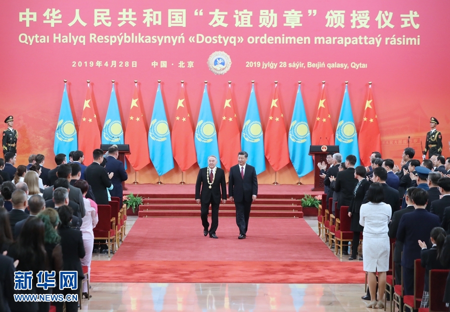 新華社北京4月28日電(記者白潔、馬巖)國家主席習(xí)近平28日在人民大會堂中央大廳為哈薩克斯坦首任總統(tǒng)納扎爾巴耶夫舉行“友誼勛章”頒授儀式。