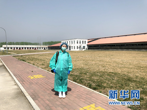 圖為記者穿戴消毒衛(wèi)生裝備進(jìn)入良種場(chǎng)采訪。 新華網(wǎng)馮文雅/攝