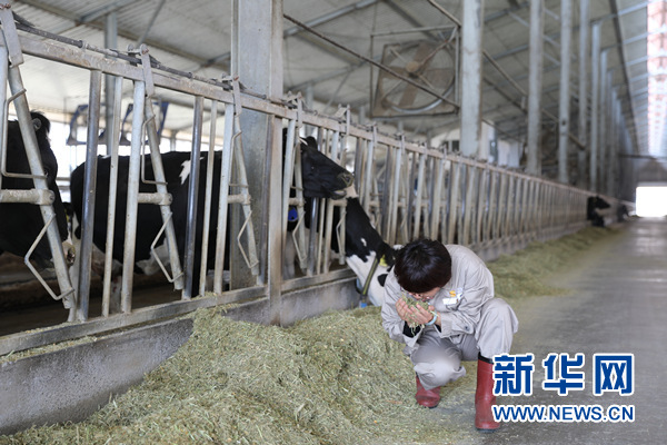 圖為叢慧敏在檢查奶牛吃的飼料。新華網(wǎng)汪亞/攝