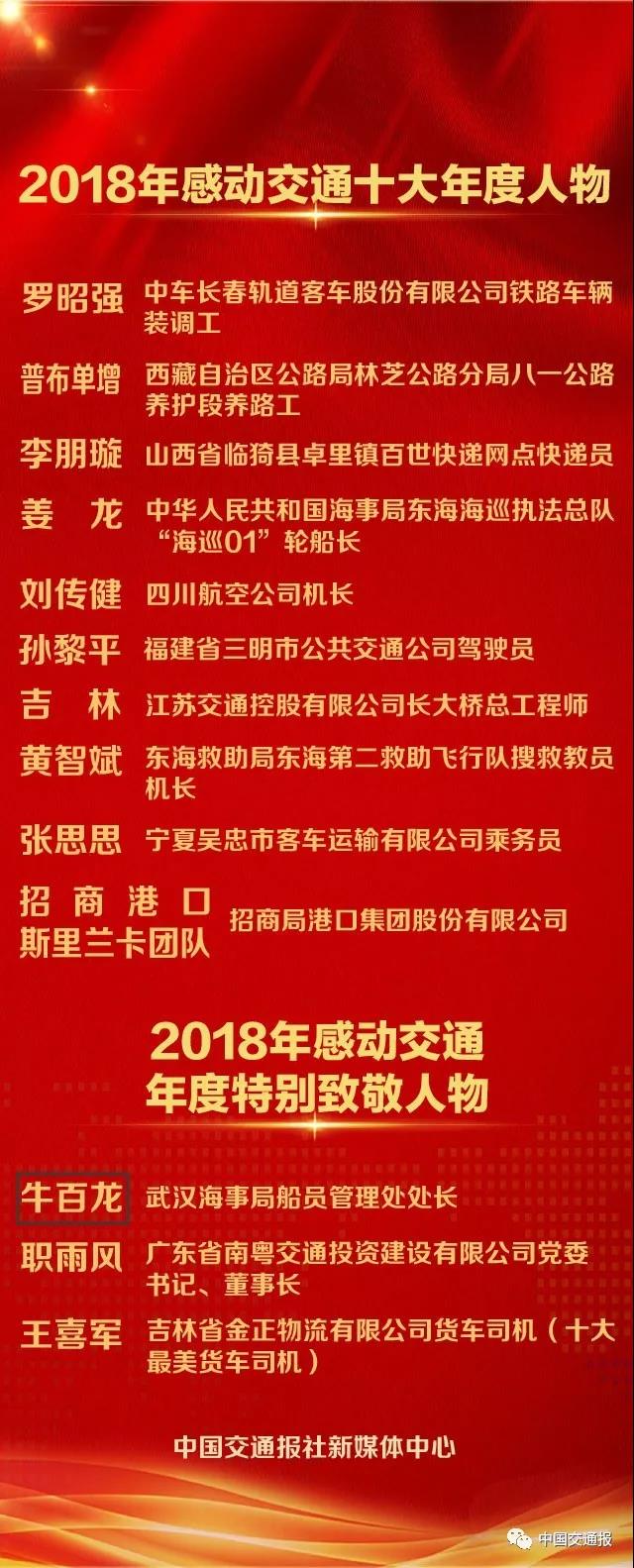另外,將青春和生命奉獻給海事交通事業(yè)的武漢海事局船員管理處處長牛百龍;胸懷大愛,積極踐行“大道為公”理念的廣東南粵交通投資建設有限公司黨委書記、董事長職雨風;400萬公里安全駕駛、細心工作、熱心助人的吉林省物流貨車司機王喜軍榮獲“2018年感動交通年度特別致敬人物”稱號。