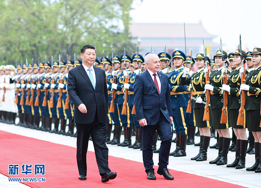 4月29日,國(guó)家主席習(xí)近平在北京人民大會(huì)堂同瑞士聯(lián)邦主席毛雷爾舉行會(huì)談。這是會(huì)談前,習(xí)近平在人民大會(huì)堂東門(mén)外廣場(chǎng)為毛雷爾舉行歡迎儀式。 新華社記者 劉衛(wèi)兵 攝