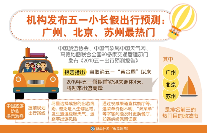 新華社北京4月29日電(記者魯暢)中國旅游協(xié)會、中國氣象局中國天氣網(wǎng)、高德地圖聯(lián)合全國90多家交通管理部門發(fā)布《2019五一出行預(yù)測報告》,報告指出,自取消五一“黃金周”以來,今年五一假期首次迎來調(diào)休4天,將迎來出游高峰,其中廣州、北京、蘇州是排名前三的熱門目的地城市。