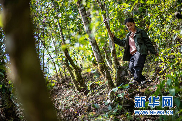 云南貢山縣獨(dú)龍江鄉(xiāng)巴坡村森林資源管護(hù)隊(duì)小隊(duì)長木秋云在林間巡護(hù)(4月25日攝)。?新華社記者 江文耀 攝