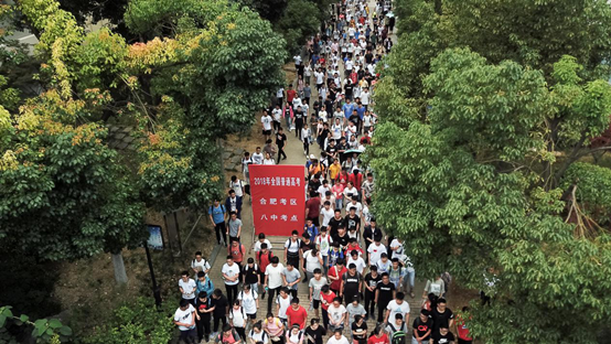 2018年6月7日,高考首場(chǎng)科目考試結(jié)束。在安徽省合肥市第八中學(xué)考點(diǎn),完成第一門(mén)考試的考生走出考場(chǎng)(無(wú)人機(jī)拍攝)。 新華社記者張端攝