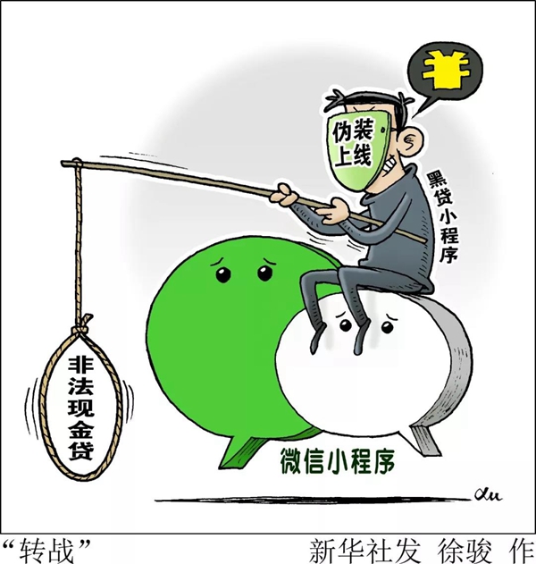 ——“套路貸”等違規(guī)App的“中轉(zhuǎn)站”。在多個(gè)互聯(lián)網(wǎng)公司的小程序中搜索“貸款”二字,填寫相關(guān)職業(yè)、家庭、財(cái)產(chǎn)等信息后,半月談?dòng)浾呤盏搅藸I(yíng)銷人員的微信或QQ號(hào),添加后發(fā)現(xiàn)對(duì)方推薦的貸款工具實(shí)為“套路貸”。同時(shí)一些用戶反映,有的小程序成涉黃、涉賭的“中轉(zhuǎn)站”,通過(guò)小程序吸引人加入指定聊天群后,接下來(lái)的就是色情交易、賭博活動(dòng)等。