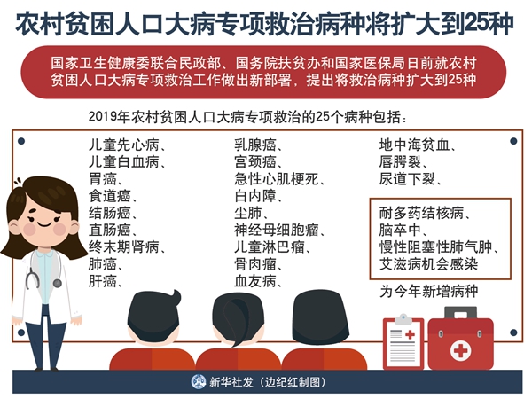 新華社北京5月14日電(記者屈婷)國家衛(wèi)生健康委聯(lián)合民政部、國務院扶貧辦和國家醫(yī)保局日前就農(nóng)村貧困人口大病專項救治工作做出新部署,提出將救治病種擴大到25種。