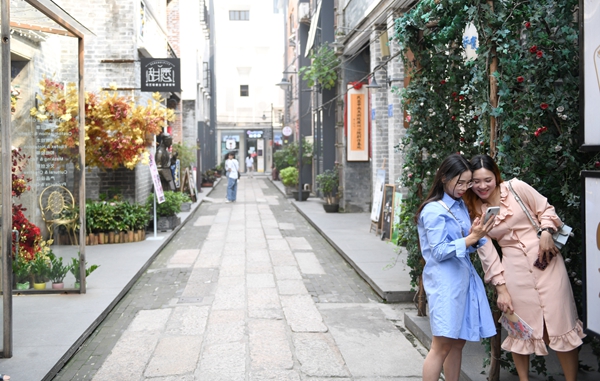 游人在改造后的永慶坊里拍照(4月9日攝)。新華社記者 盧漢欣 攝
