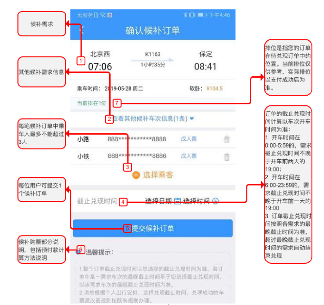 候補購票訂單的提交、兌現(xiàn)時間與網(wǎng)站運營時間一致,為每日的6:00至23:00。開車時間在0:00-5:59的,候補終止時間不晚于開車前兩天的19:00;開車時間在6:00-23:59的,候補終止時間不晚于開車前一天的19:00。