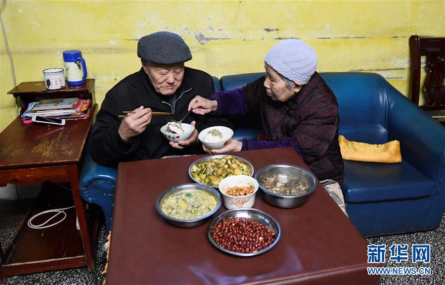 張富清和老伴在家吃晚飯(3月31日攝)。新華社記者 程敏 攝