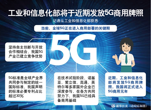 新華社北京6月3日電(記者張辛欣)記者從工業(yè)和信息化部獲悉,當前,全球5G正在進入商用部署的關鍵期。堅持自主創(chuàng)新與開放合作相結合,我國5G產業(yè)已建立競爭優(yōu)勢。5G標準是全球產業(yè)界共同參與制定的統(tǒng)一國際標準,我國聲明的標準必要專利占比超過30%。在技術試驗階段,諾基亞、愛立信、高通、英特爾等多家國外企業(yè)已深度參與,在各方共同努力下,我國5G已經具備商用基礎。近期,工業(yè)和信息化部將發(fā)放5G商用牌照,我國將正式進入5G商用元年。我們一如既往地歡迎國內外企業(yè)積極參與我國5G網絡建設和應用推廣,共同分享我國5G發(fā)展成果。