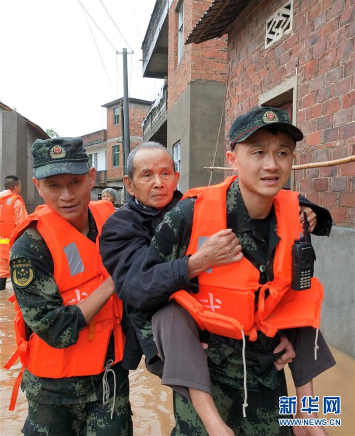 6月7日,武警江西省總隊上饒支隊官兵在玉山縣六都鄉(xiāng)六都村轉(zhuǎn)移被洪水圍困的群眾。新華社發(fā)(吳展 攝)