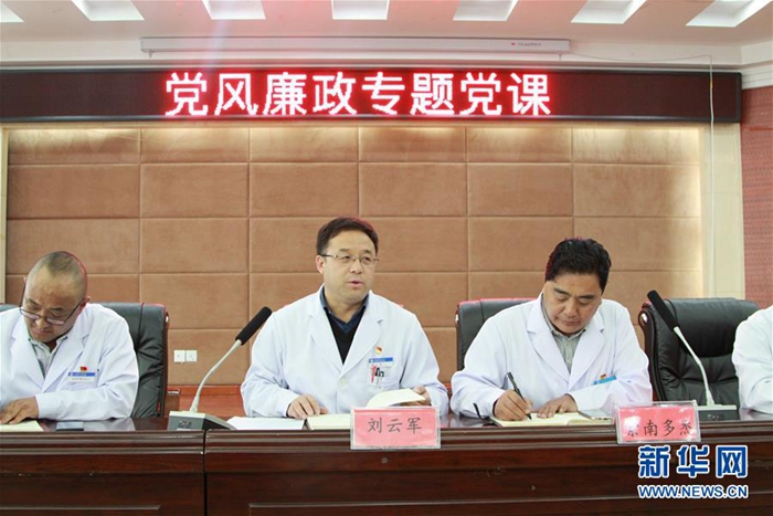 這是來(lái)自北京的援青干部劉云軍(中)在黨風(fēng)廉政專(zhuān)題黨課上(資料照片)。新華社發(fā)