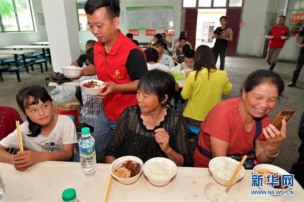 6月9日,在江西省吉安市永新縣高橋樓鎮(zhèn)高橋中學安置點內,志愿者為受災村民端來熱飯熱菜。新華社記者 彭昭之 攝