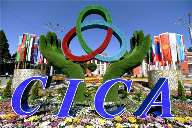 這是6月13日在塔吉克斯坦首都杜尚別拍攝的亞洲相互協(xié)作與信任措施會(huì)議標(biāo)識(shí)。新華社記者 沙達(dá)提 攝