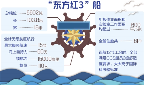 “東方紅3”船是一艘5000噸級新型深遠(yuǎn)海綜合科學(xué)考察船,以培養(yǎng)深海大洋創(chuàng)新型人才為首要任務(wù),融合科學(xué)研究、科學(xué)考察、高新技術(shù)研發(fā)應(yīng)用為一體。該船總長103.8米、寬18米,海上自持力長達(dá)60天,可連續(xù)航行1.5萬海里;載員110人,甲板作業(yè)面積和實(shí)驗(yàn)室工作面積均超過600平方米。該船是目前世界上最安靜,定員最多,經(jīng)濟(jì)性、振動(dòng)噪聲、電磁兼容等指標(biāo)要求最高,作業(yè)甲板和實(shí)驗(yàn)室面積利用率最大、綜合科考功能最完備的新一代海洋綜合科考船。