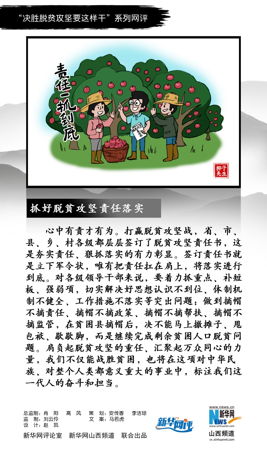 心中有責(zé)才有為。打贏脫貧攻堅(jiān)戰(zhàn),省、市、縣、鄉(xiāng)、村各級都層層簽訂了脫貧攻堅(jiān)責(zé)任書,這是夯實(shí)責(zé)任、狠抓落實(shí)的有力彰顯。簽訂責(zé)任書就是立下軍令狀,唯有把責(zé)任扛在肩上,將落實(shí)進(jìn)行到底。對各級領(lǐng)導(dǎo)干部來說,要著力抓重點(diǎn)、補(bǔ)短板、強(qiáng)弱項(xiàng),切實(shí)解決好思想認(rèn)識(shí)不到位、體制機(jī)制不健全、工作措施不落實(shí)等突出問題;做到摘帽不摘責(zé)任、摘帽不摘政策、摘帽不摘幫扶、摘帽不摘監(jiān)管,在貧困縣摘帽后,決不能馬上撤攤子、甩包袱、歇歇腳,而是繼續(xù)完成剩余貧困人口脫貧問題。肩負(fù)起脫貧攻堅(jiān)的重任、匯聚起萬眾同心的力量,我們不僅能戰(zhàn)勝貧困,也將在這項(xiàng)對中華民族、對整個(gè)人類都意義重大的事業(yè)中,標(biāo)注我們這一代人的奮斗和擔(dān)當(dāng)。(馬若虎)