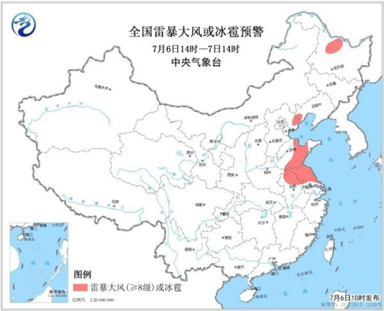 預(yù)計7月6日14時至7日14時,黑龍江北部、河北東北部、山東中部、安徽北部、江蘇中北部等地的部分地區(qū)將有8-10級雷暴大風(fēng)或冰雹天氣,局地將出現(xiàn)極端雷暴大風(fēng),瞬時風(fēng)力可達(dá)10級以上;黑龍江北部、遼寧西部、河北東部、北京東部、天津、山東中部、安徽東北部、江蘇中北部、云南西部和北部、貴州南部、湖南中南部、江西中部、浙江北部和南部、福建中北部、廣西北部以及廣東北部等地的部分地區(qū)將有短時強降水,小時雨量20-50毫米,局地可達(dá)70毫米以上。