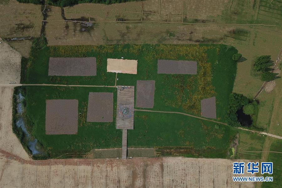 6月23日無(wú)人機(jī)拍攝的位于浙江省杭州市的良渚國(guó)家考古遺址公園的宮殿區(qū)。新華社記者 黃宗治 攝
