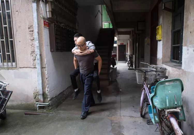 張海林背著吳元渺去參加愛心服務隊的公益活動。